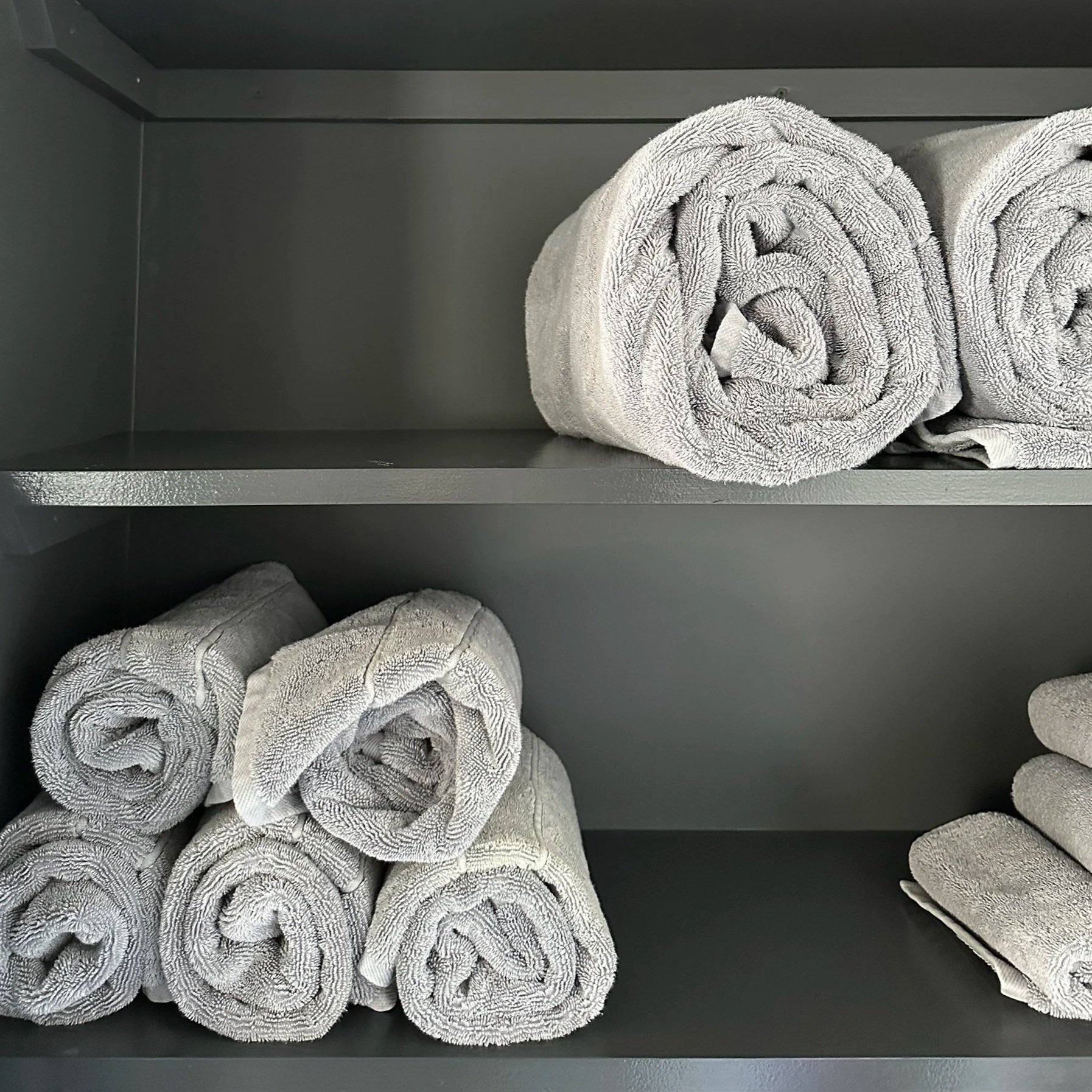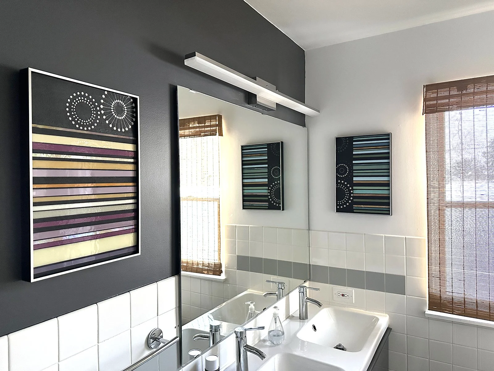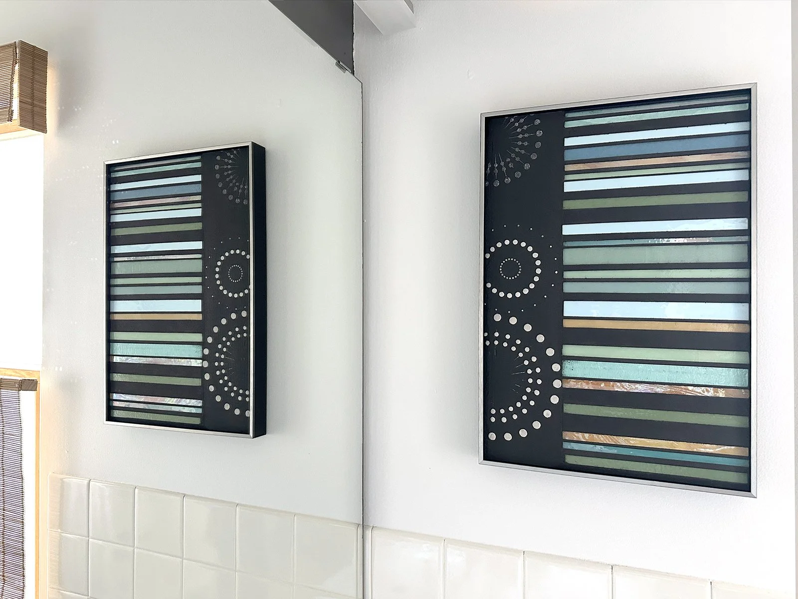 Commissioned pieces bring warmth and shimmer to a gray-and-white bathroom—an environment where art is often overlooked. Glass and concrete prove ideal for this setting, offering durable color, subtle reflectivity, and an unexpected sense of presence in a space typically inhospitable to artwork.