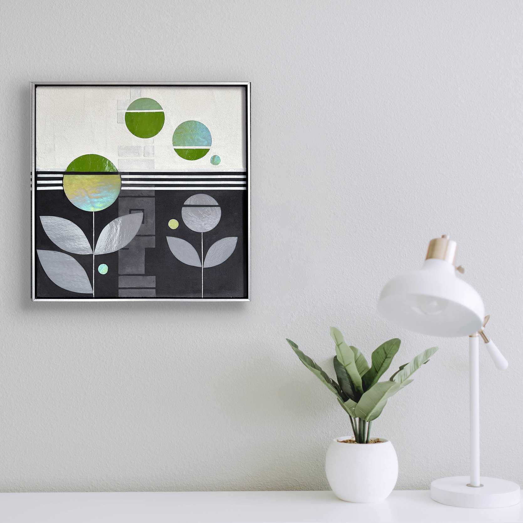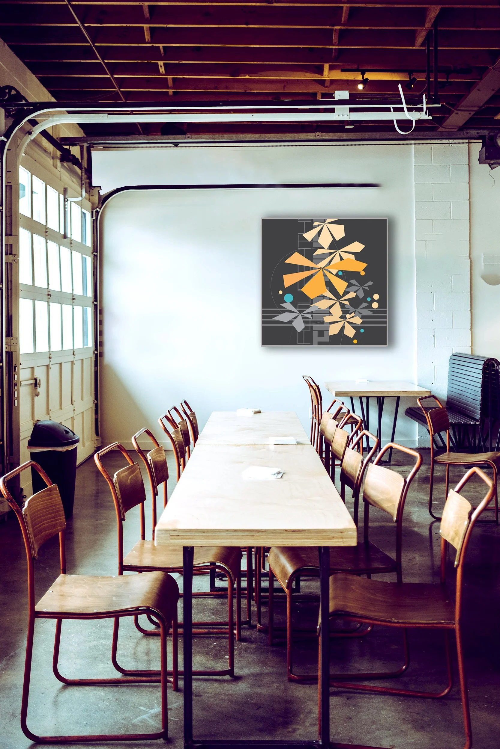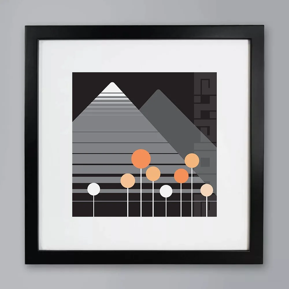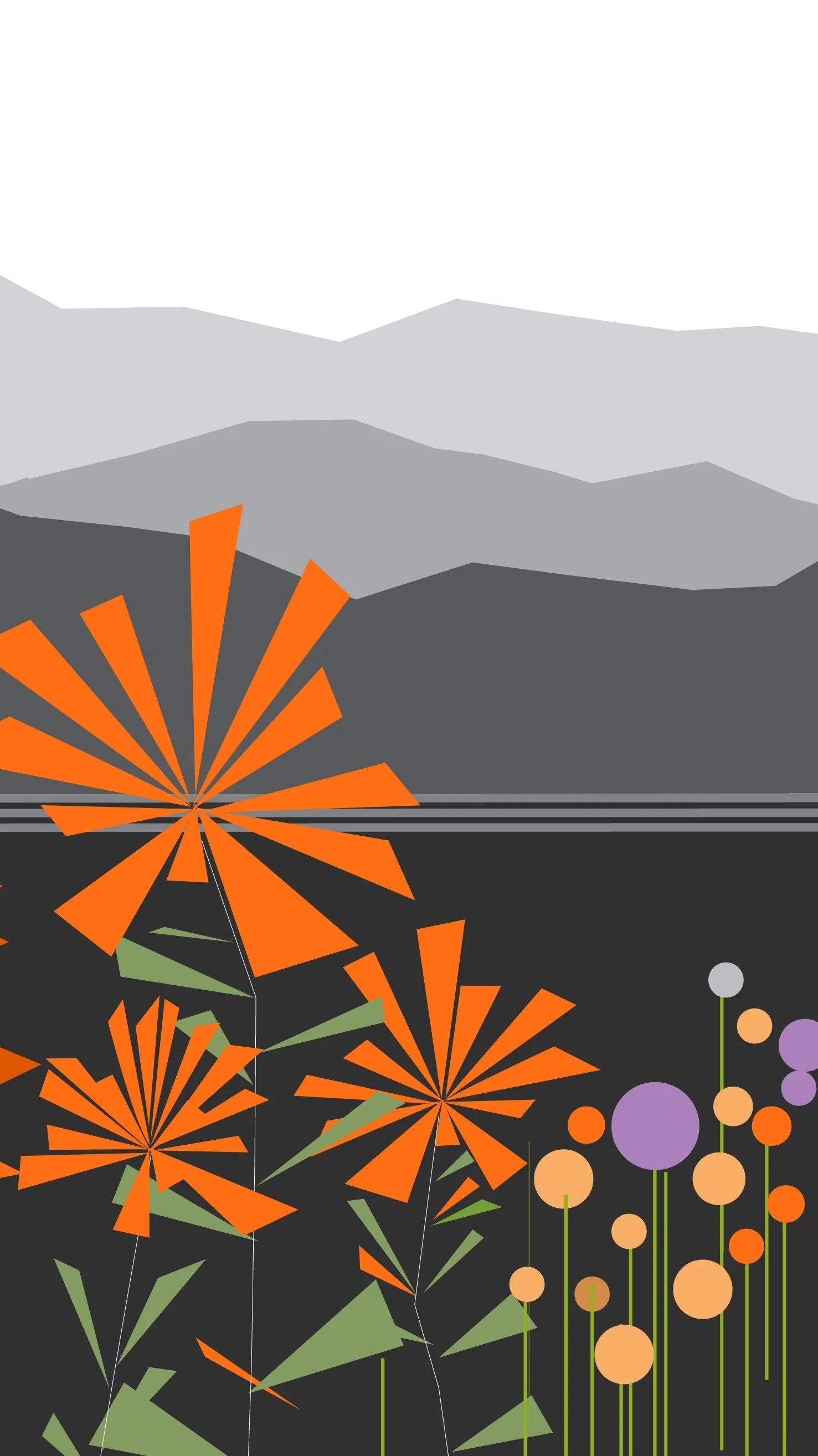 The artwork draws inspiration from the immersive perspective of wildflower viewing—where one must get low to the ground to truly appreciate the delicate blooms set against the vastness of the mountains. The composition highlights lupin in iridescent violet, with vibrant pops of orange and amber wildflowers bringing warmth and movement to the minimalist mountainscape. This interplay of color and form creates a visually rich experience that shifts with changing light.